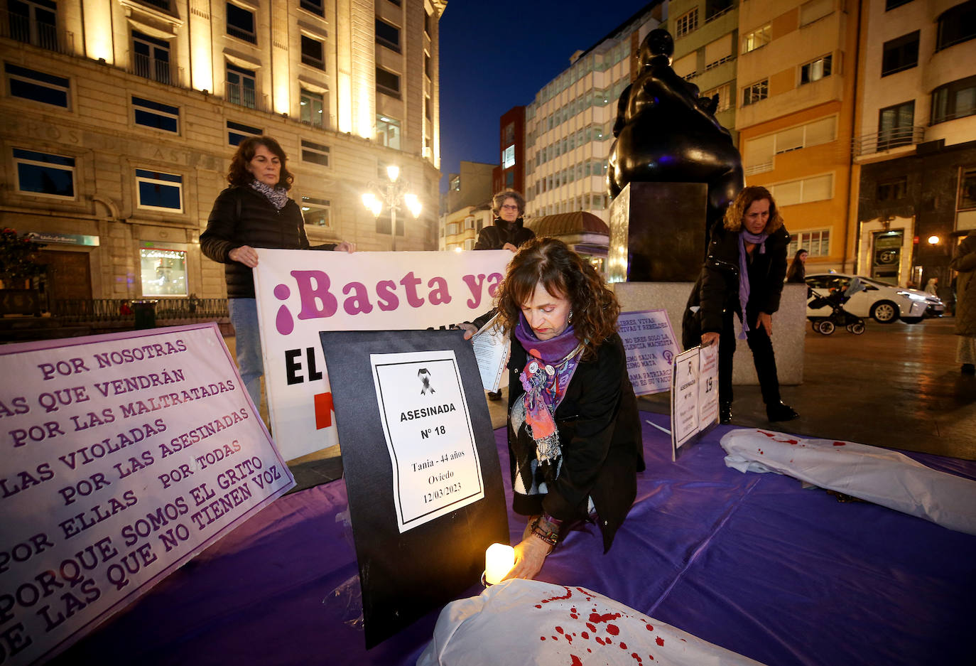 A la concentración acudieron los concejales Diego Valiño (PSOE) y Ana Taboada (Somos) y se realizó una 'performance' con dos sábanas manchadas de sangre acompañadas de una esquela por Coinac y otra por una mujer de 33 años que fue asesinada el lunes en Alcobendas (Madrid). También colocaron flores, velas y un cartel donde se podía leer «nos queremos libres, vivas, feministas, combativas y rebeldes». «No lo olvides, tú no eres solo la víctima en la violencia machista».