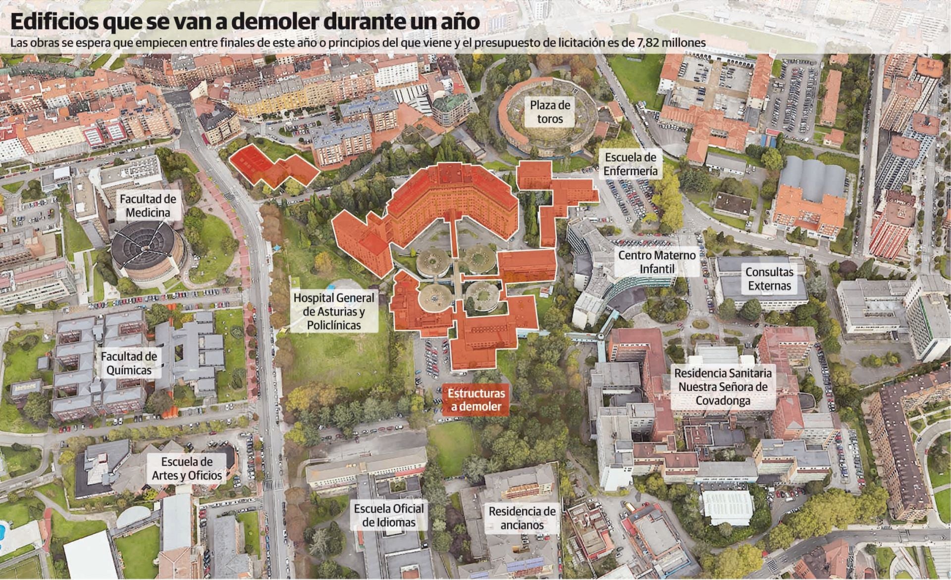 De junio a junio. Si en el sexto mes de 2014 se llevó a cabo la mayor parte del traslado del viejo Hospital Universitario Central ... de Asturias (HUCA) de El Cristo a La Cadellada; en el del presente 2024 se licitarán los derribos de los edificios propiedad del Principado –el Hospital General, el almacén y taller y todos los inmuebles anexos excepto los Hongos– que no tendrán una segunda vida. Así lo anunció en la mañana de ayer el portavoz del gobierno del Principado, Guillermo Peláez, a lo largo de una rueda de prensa celebrada en la sede de Presidencia. Detalló que el Consejo de Gobierno del pasado viernes dio el visto bueno a la licitación de este contrato que alcanzará los 7,82 millones de euros (IVA incluido) y tendrá un periodo de ejecución de doce meses.