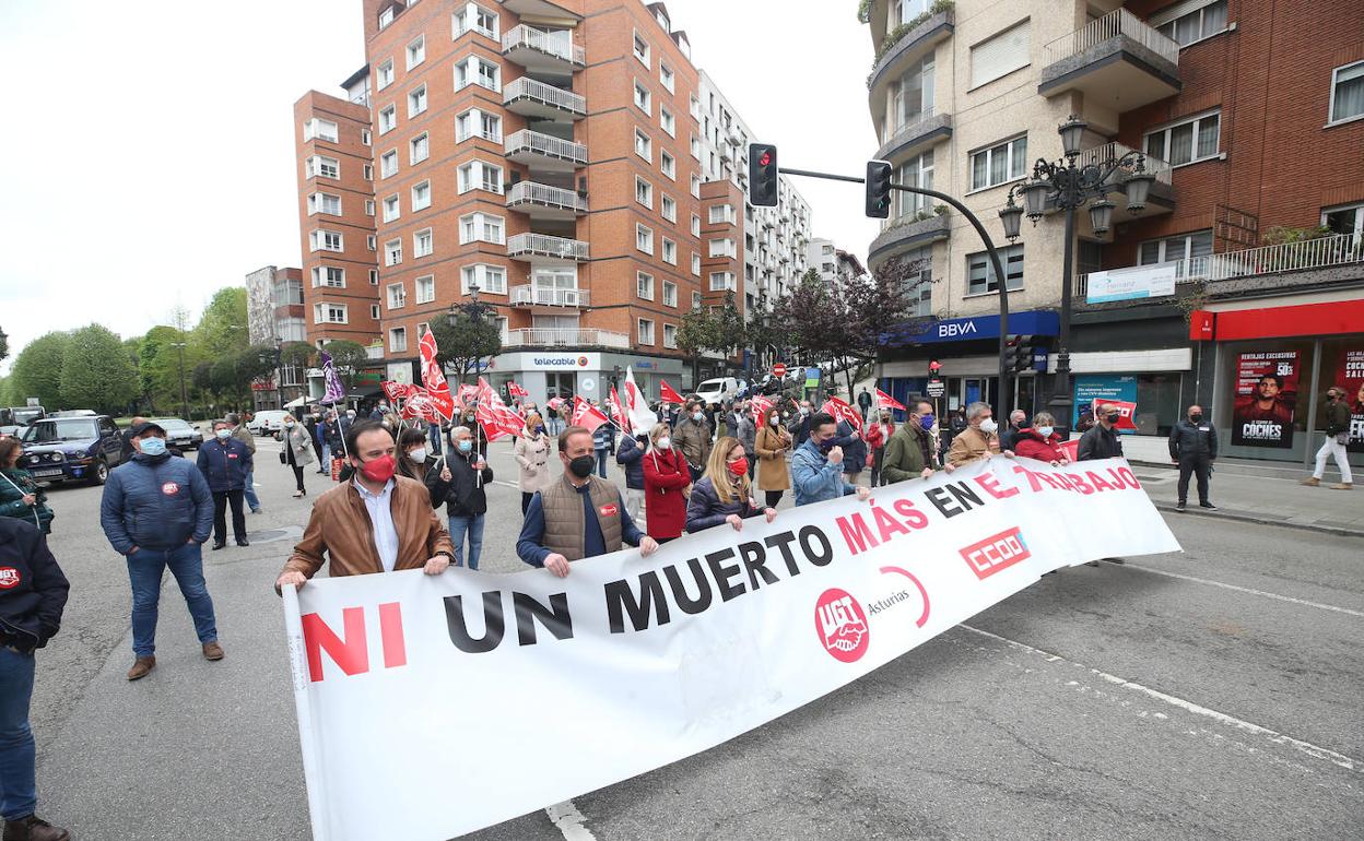 Los sindicatos UGT y CCOO han salido a las calles de Oviedo para concentrarse contra la siniestralidad laboral. Hoy, a las 12.00 horas, las calles de Santa Teresa, Cervantes, y Avenida de Galicia se llenaban de gente en protesta contra estos hechos que ocurren asiduamente en el entorno laboral. Durante la concentración se guardaron cinco minutos de silencio en señal de duelo por la muerte del trabajador César García, de la compañía ASA en la planta agropecuaria de Paredes (Siero) el pasado jueves.