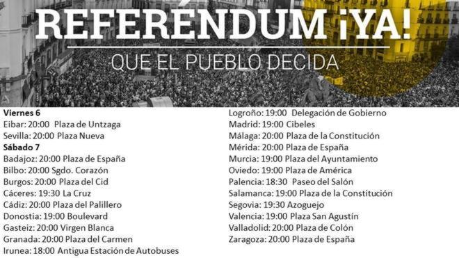 Las marchas para reclamar una consulta popular en la que la ciudadanía decida entre Monarquía o República están convocadas, hasta el momento, en Badajoz, Bilbao, Burgos, San Sebastián, Cáceres, Cádiz, Pamplona, Castellón, Jerez, León, Logroño, Madrid, Málaga, Mérida, Murcia, Oviedo, Palencia, Salamanca, Valencia, Valladolid, Segovia y Zaragoza.