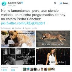 Lo que nadie esperaba es que la televisión pública se sumara a ellos. El Twitter oficial de La 2 ha publicado este tuit: "No, lo lamentamos, pero, aun siendo variada, en nuestra programación de hoy no estará Pedro Sánchez". Esta peculiar forma de anunciar su programación ha sido retuiteada por centenares de personas.