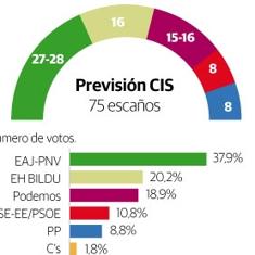Los nacionalistas vascos aguantarían el tipo, de acuerdo al sondeo del centro demoscópico oficial, ya que mantendrían, pese a la fuerte irrupción de Podemos, la misma representación que obtuvieron en los comicios de 2012, entonces llegaron a los 27 representantes. La formación que dirige Pablo Iglesias sumaría 15 o 16 escaños en el Parlamento vasco, y quedaría un poco por detrás en intención de voto respecto a la izquierda abertzale de EH Bildu, que asimismo lograría 16 diputados.