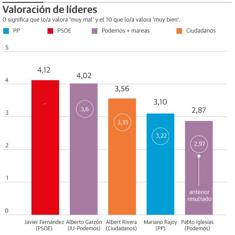 Pese a que es el segundo líder nacional con peor valoración, el presidente del Gobierno ha conseguido ahora mejorar su nota respecto al anterior barómetro, publicado en octubre. Mariano Rajoy obtiene en la encuesta de enero un 3,10, frente al 2,97 del anterior estudio. Pablo Iglesias es el peor valorado. La guerra interna en Podemos le pasa factura y los españoles le dan un 2,87 de nota (2,97 logró en la anterior encuesta). Su compañero de alianza electoral y coordinador general de Izquierda Unida, Alberto Garzón, logra un 4,02 de valoración, convirtiéndose en el segundo líder nacional con mejor nota. Albert Rivera se consolida en la tercera posición, con un 3,56.