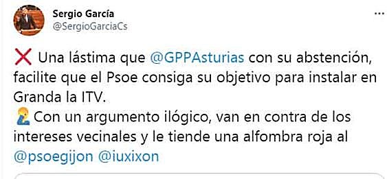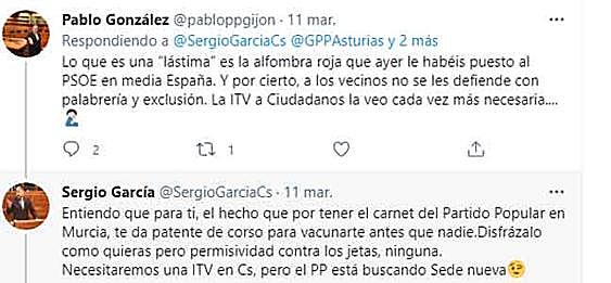 El primero criticó al PP que tendiera «una alfombra roja» al PSOE en su objetivo de instalar en Granda la ITV. El segundo replicó que para «alfombra roja» la que Ciudadanos le ha puesto al PSOE «en media España», recomendando incluso a la formación naranja pasar la «ITV». «Necesitaremos una ITV, pero el PP está buscando sede nueva», le respondió García con emoticono de guiño incluido. «Y Ciudadanos Murcia diputados nuevos», espetó el popular en un último tuit.