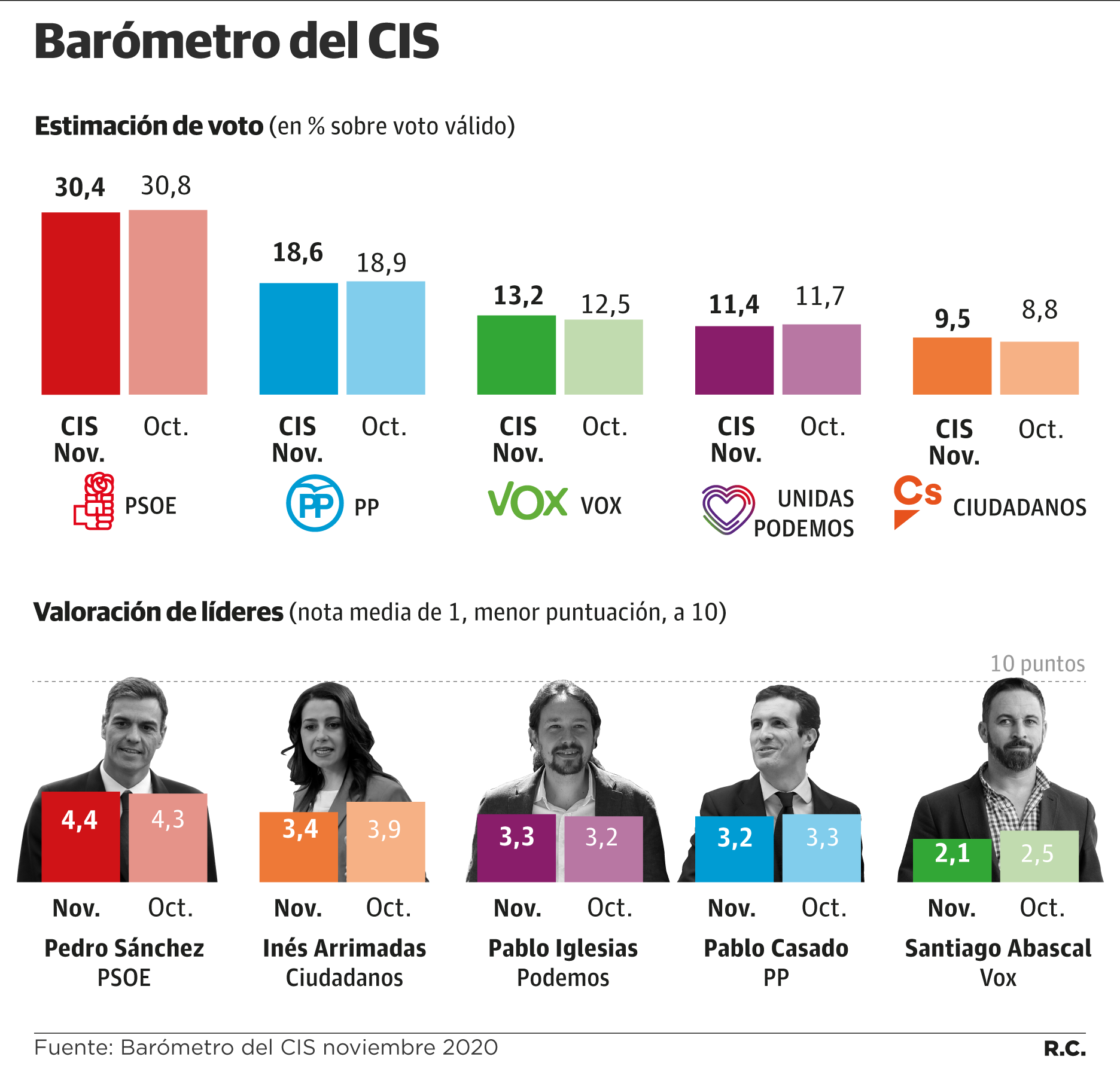 El PSOE, de acuerdo al barómetro publicado este miércoles, seguiría como primera fuerza con una estimación de voto del 30,4%. El PP se mantendría como primer partido de la oposición, con un 18,6%. Ambos retroceden cuatro y tres décimas respecto al sondeo de hace un mes. Se mantiene estable asimismo la distancia entre ambos. Los socialistas aventajan a los populares en 11,8 puntos, una décima por debajo que el mes pasado, pero tres puntos y medio por encima de los resultados del 10 de noviembre de 2019. En aquella cita electoral, los socialistas aventajaron en 7,3 puntos a los populares, que sumaron el 21%.