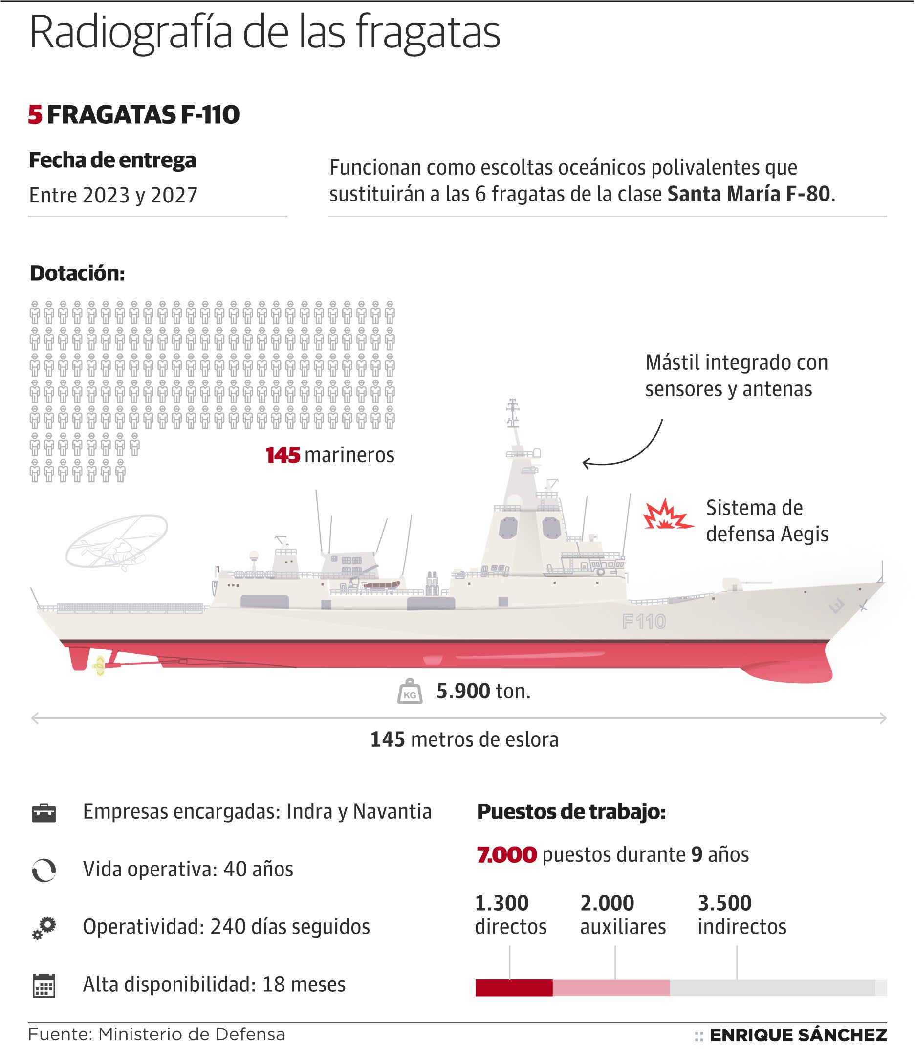 El Ministerio de Defensa de la era Margarita Robles está llamado a pasar a la historia. Y no solo por la crisis que se generó a principios de septiembre cuando, por su cuenta y riesgo, decidió paralizar la venta de bombas a Arabia Saudí. Una situación que tuvo que reconducir el propio presidente Pedro Sánchez para garantizar los 6.000 puestos de trabajo que se pusieron en riesgo en Navantia de la construcción de cinco corbetas para las fuerzas armadas saudíes. Pues bien, ahora el Gobierno acaba de anunciar una inversión de más de 7.300 millones de euros, lo que supone el mayor gasto militar que se recuerda. El Consejo de Ministros ha aprobado este viernes tres nuevos programas con impacto directo en la industria de defensa nacional. Así, se construirán cinco fragatas de la nueva clase F-110 para la Armada, 348 vehículos blindados VCR 8x8 para el Ejército de Tierra y se modernizará la flota de 70 cazas Eurofighter del Ejército del Aire.