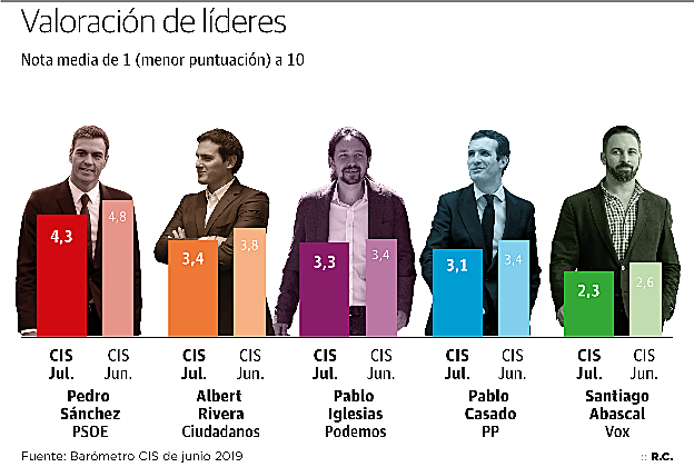 El CIS arroja aun así datos que sí pueden servir a los partidos para dibujar escenarios, siempre con la salvedad de que se trata de una foto de un momento concreto. A principios de julio, la partida de pimpón entre Sánchez e Iglesias aún no había alcanzado la intensidad de los días previos a la sesión de investidura, aunque ya había entre ambos un tira y afloja considerable. El presidente en funciones seguía negándose a un Ejecutivo de coalición, pero había asegurado que aceptaría las sugerencias de Podemos para nombrar ministros independientes. Pablo Casado había cogido aire gracias a los pactos postelectorales en ayuntamientos y municipios. Y Ciudadanos todavía no había sufrido el goteo de bajas en la dirección inaugurado por su responsable de Economía, Toni Roldán.
