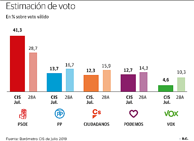 Si Pedro Sánchez tuviera que hacer caso a los datos aportados por el último CIS, elaborado entre el 1 y el 11 de julio, sus incentivos para evitar que el próximo 10 de noviembre haya de nuevo elecciones serían nulos. El barómetro que ayer hizo pública la institución presidida por el socialista José Félix Tezanos otorga al PSOE una intención de voto del 41,3%, a más de 25 puntos del PP, su inmediato competidor. Es una cifra propia de las épocas del bipartidismo, solo que ahora el Parlamento cuenta con cinco fuerzas de ámbito nacional. Al PP, el estudio le sitúa exactamente con el mismo porcentaje que el mes anterior, un 13,7%. Unidas Podemos mejoraría mínimamente, del 12,7% al 13,1% (es una diferencia poco relevante porque se encuentra dentro de los márgenes de error del sondeo) y Ciudadanos en cambio pasaría de segunda a cuarta fuerza y de un 15,8% a un 12,3%.