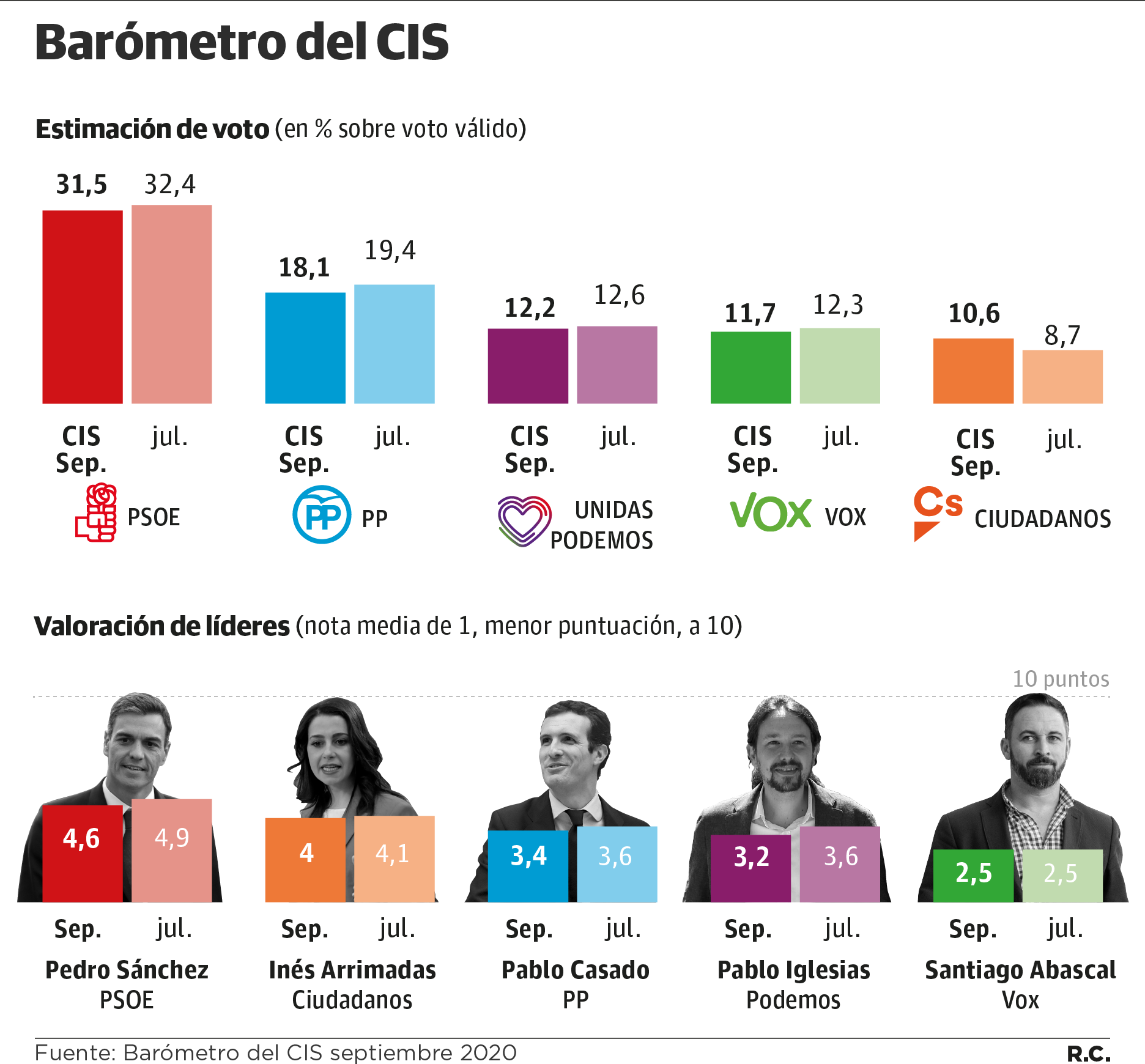 Pedro Sánchez se mantiene como el líder mejor valorado aunque suspenda con una nota de 4,6. Arrimadas ocupa la segunda posición con un 4. Pablo Casado recibe un 3,4, dos décimas más que Pablo Iglesias. Santiago Abascal es el dueño del farolillo rojo con el 2,5.