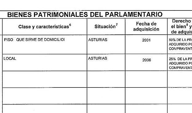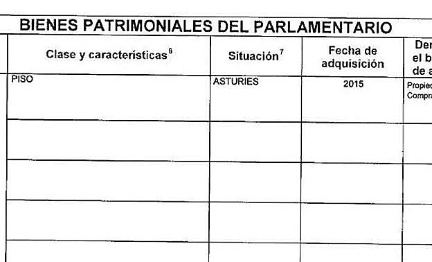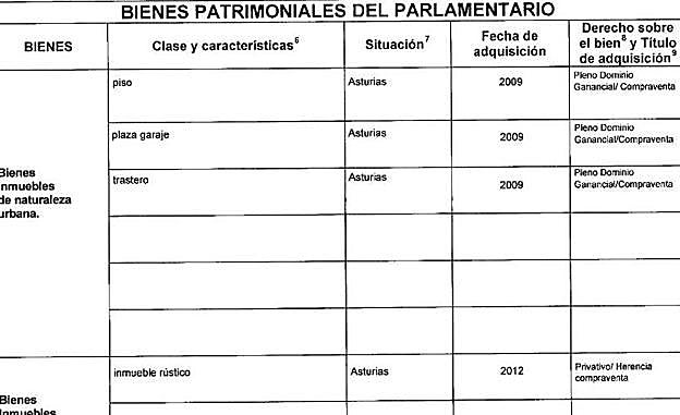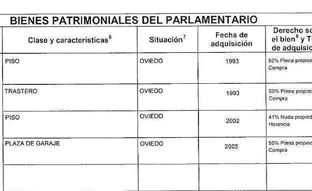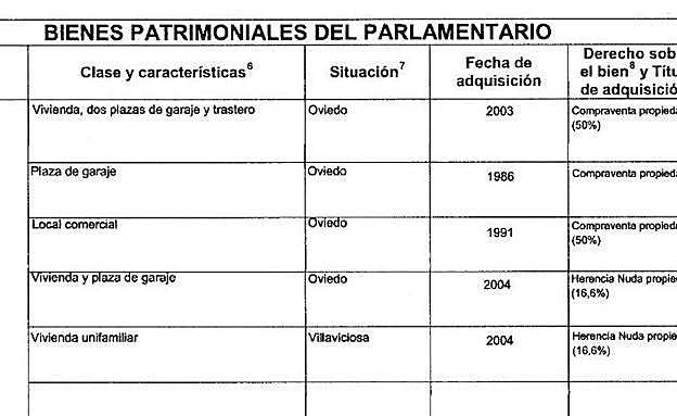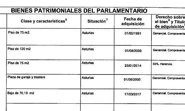 Los bienes inmuebles del diputado de Foro consisten en tres pisos, entre otros, aunque no figura préstamo hipotecario alguno en su declaración. Sólo existe un préstamo personal de 25.000 euros con Liberbank.
