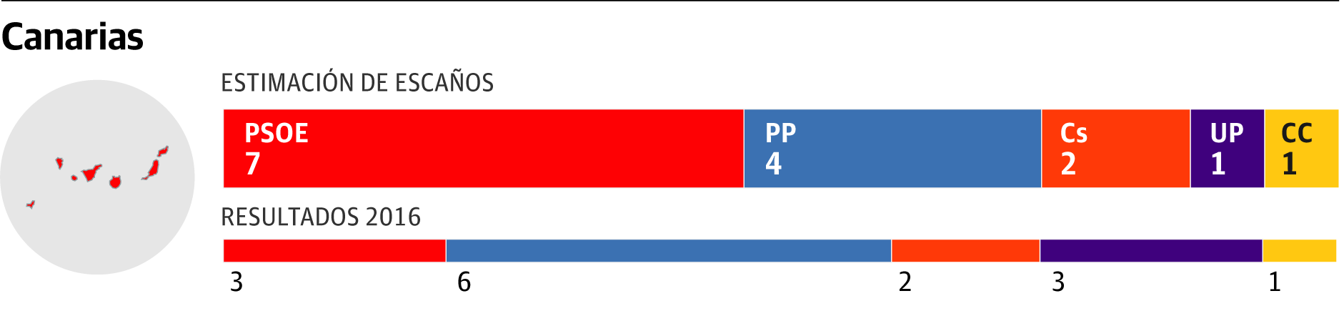El PSOE se anotaría uno de sus incrementos más espectaculares de todo el país en Canarias. Los socialistas ganarían las elecciones tras pasar de los tres escaños de 2016 a siete, a uno de la mayoría absoluta. El PP quedaría relegada a la segunda posición tras perder dos diputados y Podemos caería a la cuarta al quedarse en uno. Se mantienen estables Ciudadanos y Coalición Canaria.
