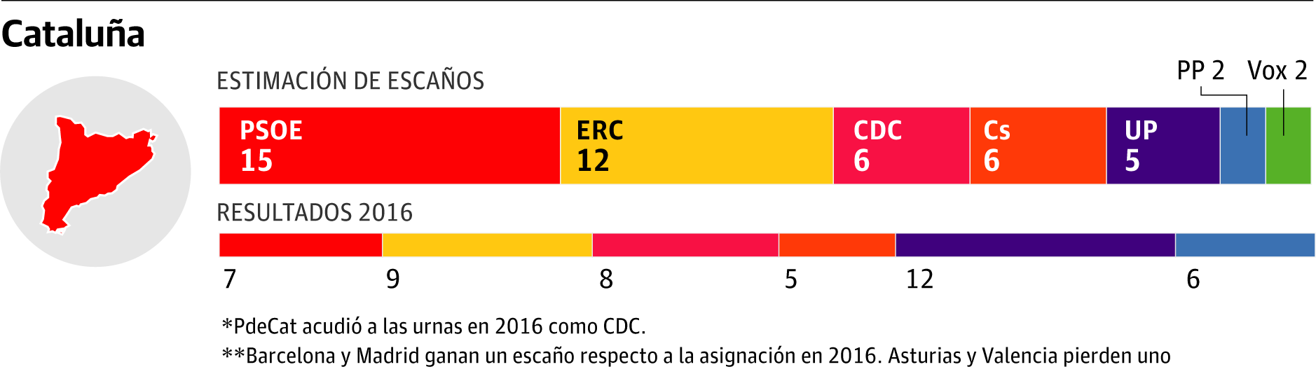 Una década después, los socialistas volverían a ganar en Cataluña. La última vez que lo hicieron fue en 2008, con José Luis Rodríguez Zapatero en la cresta de la ola y antes de que la antigua CiU y ERC apostasen por la deriva soberanista y el 'procés'. La estrategia a favor del diálogo impulsada por el Gobierno de Pedro Sánchez parece que da sus frutos. El PSOE doblaría su representación y pasaría de contar con 7 representantes en el Congreso a llegar a 15.
