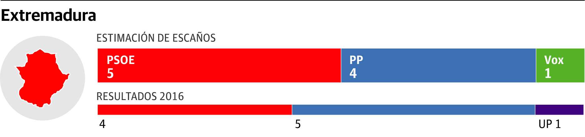 La tendencia cambia en Extremadura tras una década. Los socialistas recuperarían el liderazgo, pasarían de tener cuatro escaños a cinco a costa del PP, que haría el recorrido contrario. Vox obtendría un representante por la provincia de Badajoz y Podemos perdería el que tenía en la comunidad. Como ocurriera en 2016, Ciudadanos volvería a quedarse fuera del reparto.