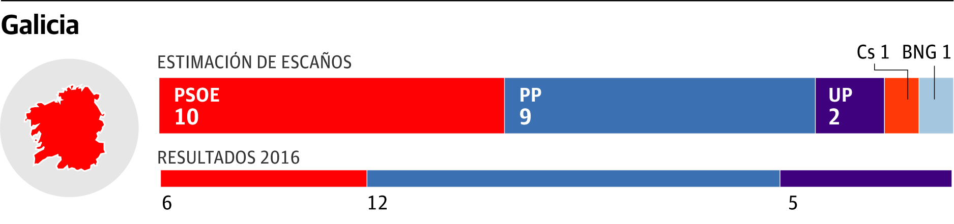 El PP registraría un histórico revés en Galicia, uno de los feudos en los que siempre ha obtenido buenos resultados. Los populares perderían tres escaños y se verían sobrepasados por el PSOE, que ganaría cuatro diputados. Tres de ellos llegarían de Podemos y su confluencia, inmersos en una importante crisis. Obtendrían representación Ciudadanos y el BNG.