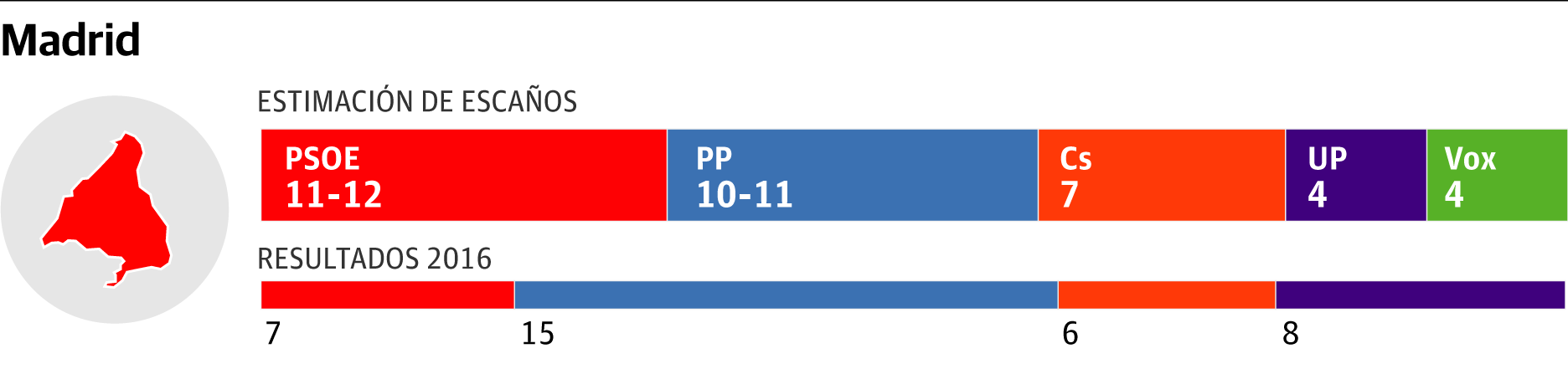 Madrid certifica las sólidas bases que mantienen socialistas y populares a pesar de la fragmentación del mapa político y de la irrupción de nuevos partidos. Tanto el PSOE y el PP se sitúan muy por encima de las otras tres formaciones en liza -Unidas Podemos, Ciudadanos y Vox- y mantienen una reñida pelea por la primera posición. Aun así, la formación liderada por Pablo Casado, que va de 'número uno', sufre un notable desgaste.