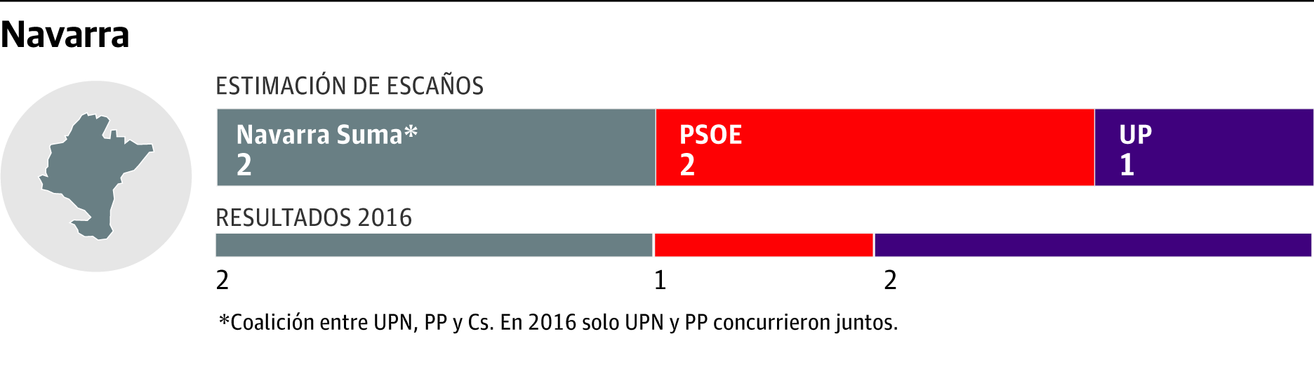 Los resultados en Navarra volverían a demostrar la pluralidad y la fragmentación política que se vive en la Comunidad Foral. En 2016, la victoria por un escaso margen fue para la alianza UPN-PP. Según la encuesta, el próximo 26 de mayo el primer puesto se lo disputarían el centro derecha y los socialistas, con dos actas para cada uno de los dos bloques. Podemos quedaría en tercer lugar.