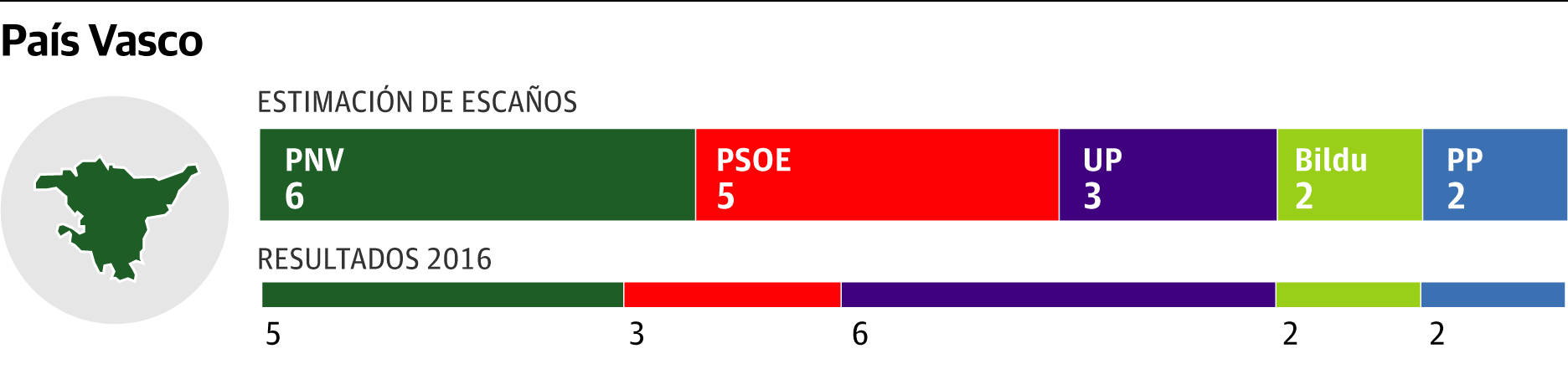 El PNV recuperaría el liderazgo que le había arrebatado Podemos las dos últimas elecciones generales. El partido morado sufre un fuerte desgaste y caería a la tercera posición, tras perder la mitad de sus escaños, ya que también le superaría el PSOE. Aupados por el tirón de Sánchez los socialistas registrarían una fuerte subida. Bildu y PP repetirían resultado y Cs y Vox quedarían fuera.