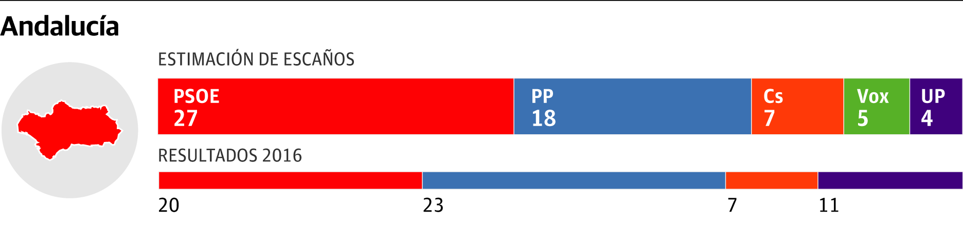 En tercera posición se quedaría Albert Rivera, que lleva como 'número dos' a Inés Arrimadas. Los naranjas suben respecto a 2016, pero no se benefician demasiado del desgaste de los populares. Apenas incrementarían su representación en un escaño. Insuficiente dadas las expectativas creadas.