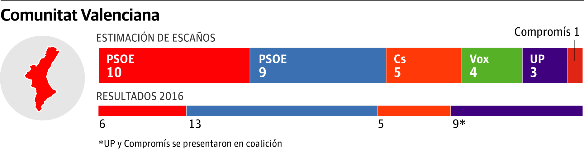 El PSOE ganaría las elecciones en la Comunidad Valenciana poniendo fin a una hegemonía del PP que ha durado 30 años. Los socialistas crecerían cuatro escaños a costa del desplome de Podemos y Compromís, que esta vez concurren por separado. Los populares perderían cuatro escaños que irían a parar a Vox, que aparece como cuarta fuerza.