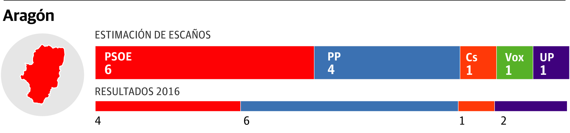 El PSOE supera al PP en Aragón. Los socialistas registran un notable incremento de apoyos para elevar su resultado desde los cuatro escaños de 2016 a seis. Por contra, los populares bajarán al segundo puesto al perder dos de sus seis diputados, uno de los cuales lo sumará Vox. El trasvase de voto útil al PSOE hará que Podemos pierda uno de los dos diputados que tiene en la comunidad.