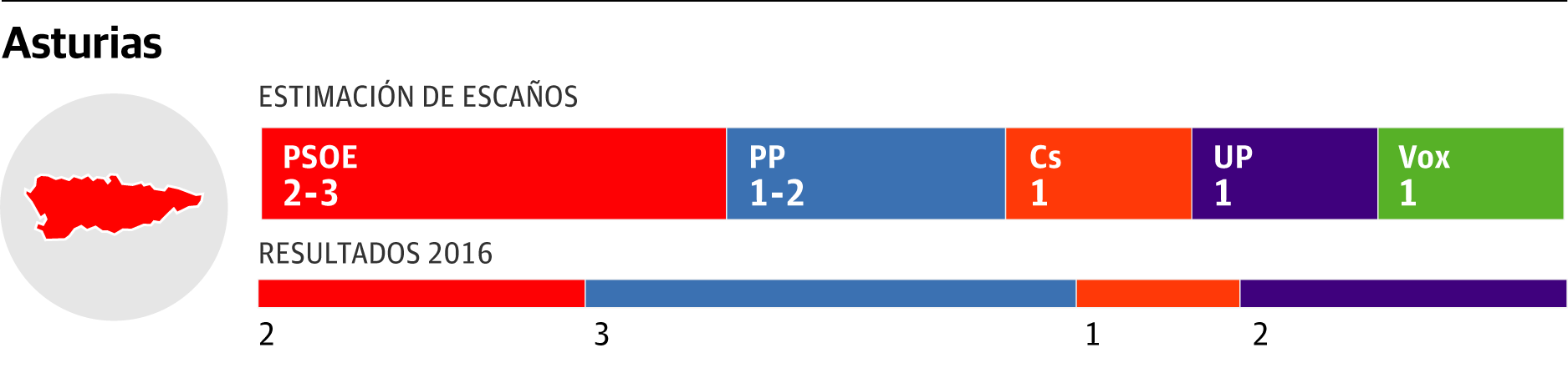 El PSOE ganaría con claridad en Asturias (obtendría el 32% de los votos) frente a una derecha más fragmentada que nunca. Retroceso significativo de la coalición PP-Foro y de Podemos e irrupción de Vox, que sumaría un escaño. Cinco fuerzas lograrían representación en el Congreso pese a que Asturias reparte esta vez siete escaños y no ocho por el declive demográfico.