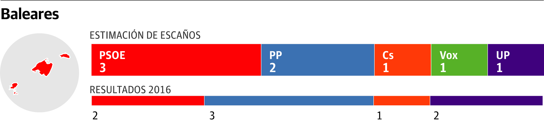 Los socialistas pasarían del tercer puesto obtenido en las últimas elecciones generales al triunfo en Baleares. El PSOE ganaría un diputado y obtendría tres de los ocho que se ponen en liza en la comunidad. El PP caería a la segunda plaza y Podemos pasaría de la segunda que logró en 2016 a la quinta al quedarse con un único escaño. El mismo que mantendría Cs y el que lograría Vox.