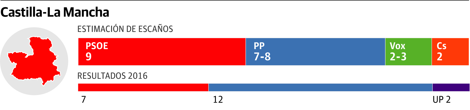 El voto útil le daría al PSOE la victoria en Castilla La Mancha. Absorbe los escaños que antes tenía Podemos frente a un PP que registraría un fuerte descenso. A los conservadores les penaliza la fragmentación del voto de la derecha y la fuerte irrupción de sus dos competidores. Vox se convertiría en la tercera fuerza de la región y Ciudadanos, que no tenía diputados, en la cuarta.