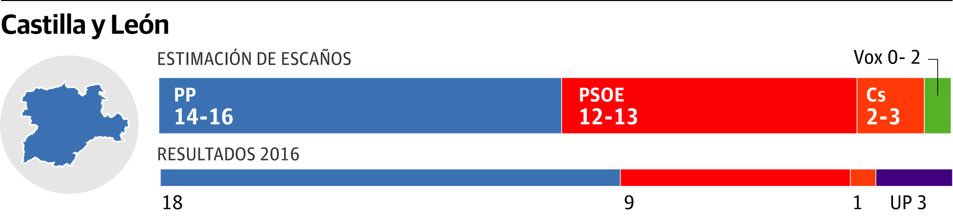 El PP volvería a ganar en Castilla y León, aunque sus resultados distan de ser buenos. El histórico granero de votos popular se resiente y el partido de Casado perdería hasta cuatro escaños, los mismos que podría ganar el PSOE. También mejoraría sus resultados Ciudadanos, mientras que Podemos caería hasta perder sus tres escaños. Vox no tiene garantizado obtener diputados.