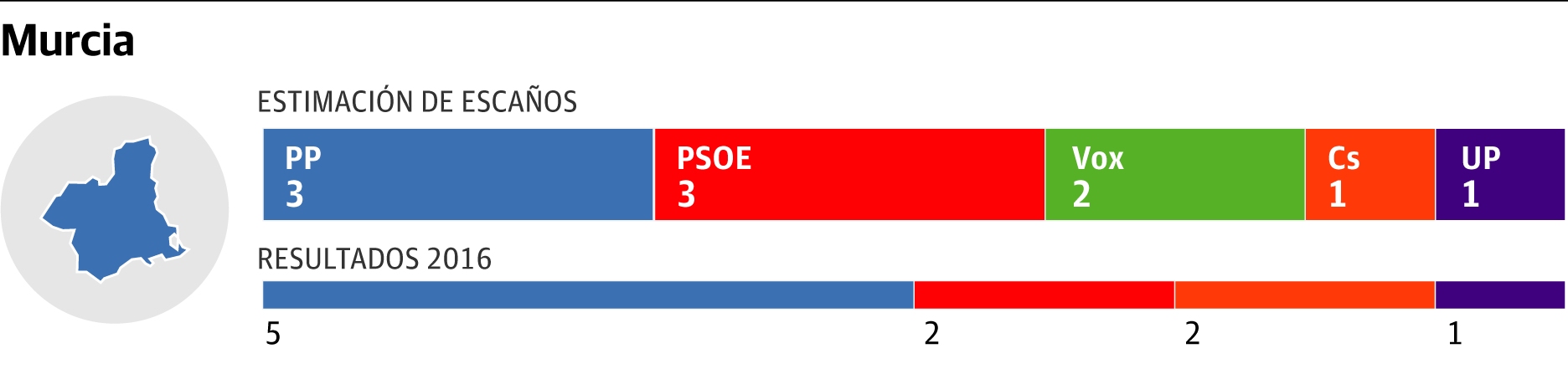 El PP ganaría en Murcia, pero perdería un tercio de los votos y dos diputados en el Congreso. Se quedaría con tres escaños, el mismo número que el PSOE, que ganaría uno. Vox irrumpe como la tercera fuerza en el territorio -dos sillones- a costa de los populares y de Ciudadanos, que perdería uno de sus dos escaños. Podemos mantendría el representante obtenido en 2016.
