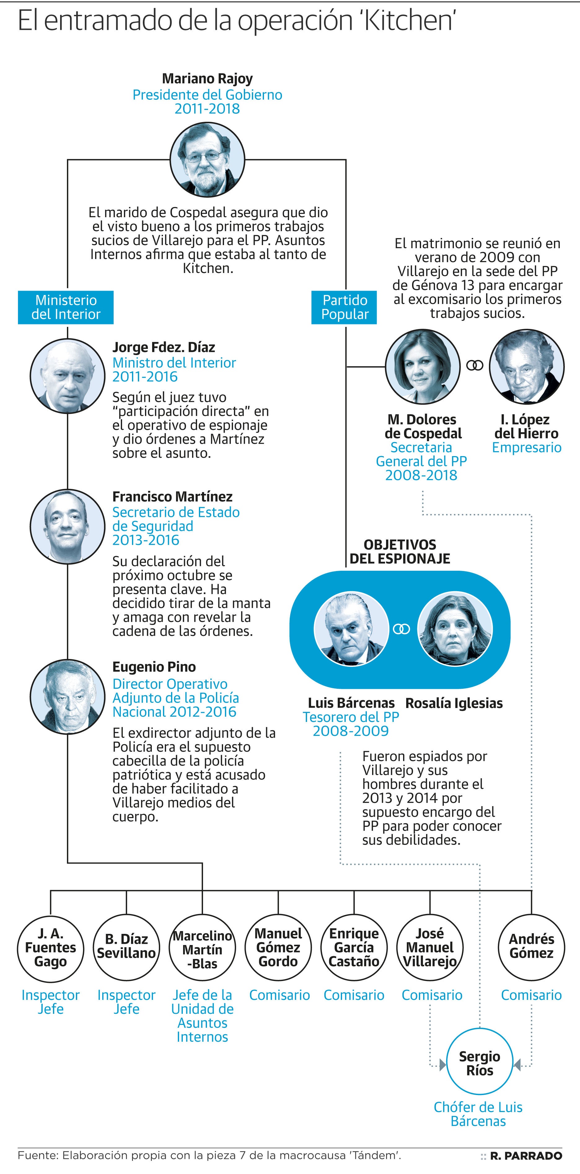 Pero así ha sido. Y la imputación de Jorge Fernández Díaz, quien fuera uno de los ministros más poderosos del primer Gobierno de Mariano Rajoy, tiene todos los visos de no ser la última de un miembro del gabinete del expresidente popular, según coinciden en señalar diversas fuentes del 'caso Kitchen', el sumario en el que García-Castellón ya investiga de lleno cómo el Partido Popular encargó al excomisario José Villarejo buscar los puntos débiles del extesorero y su entorno para un posible chantaje, conocer hasta dónde Bárcenas tenía intención de tirar de la manta y, llegado el caso, poder sustraer material comprometedor que el exsenador tuviera sobre las cuentas irregulares del PP.