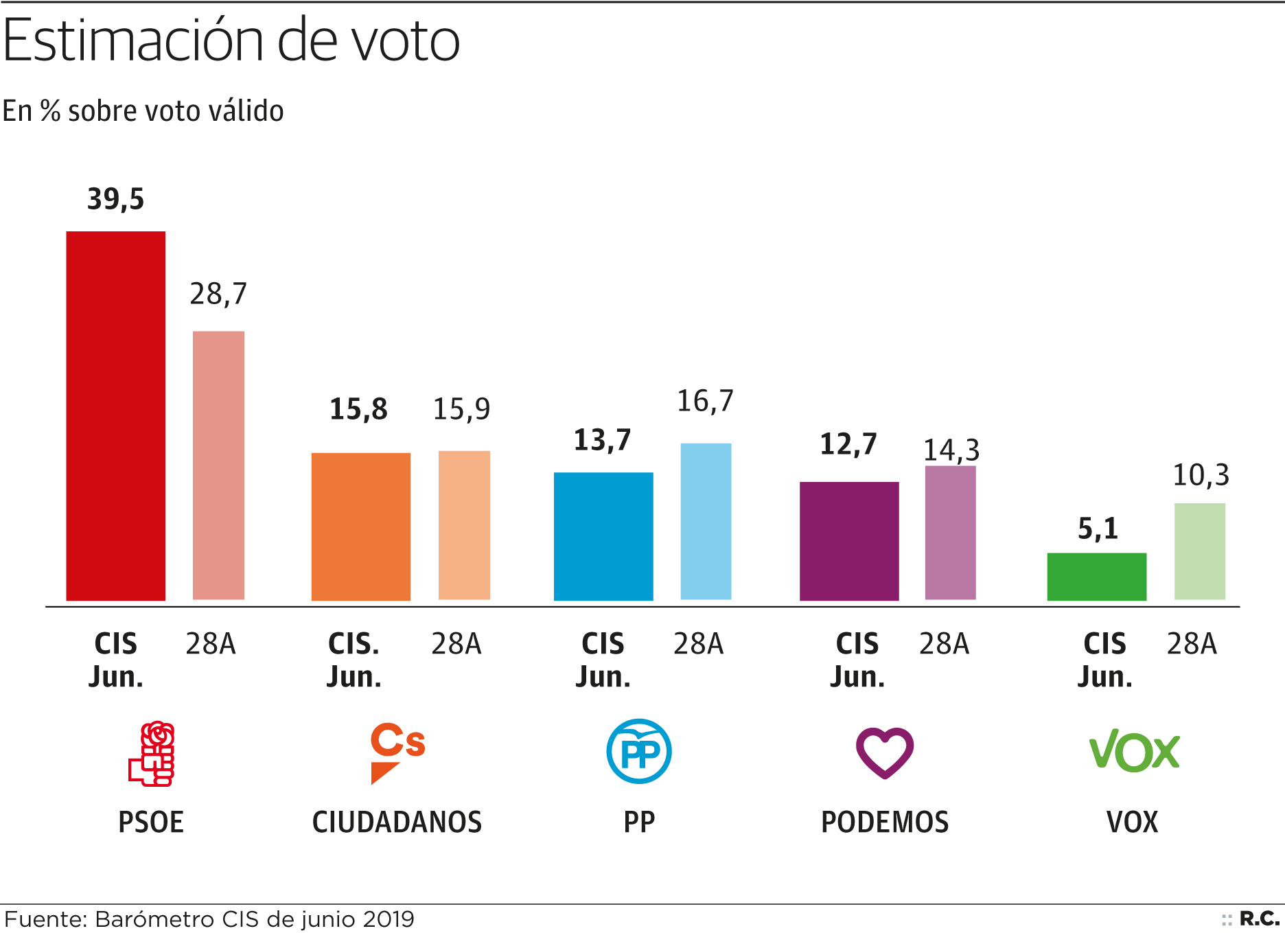 Si la amenaza de una repetición electoral por un eventual fracaso de la investidura se consuma, el PSOE, según el CIS, obtendría un triunfo inapelable. Sumaría el 39,5% de los votos, y aventajaría al segundo, Ciudadanos, en casi 25 puntos. Los liberales, no obstante, consumarían el 'sorpasso' que no lograron el 28 de abril, y con el 15,8% de las papeletas superarían al PP, que se quedaría en el 13,7%. Unidas Podemos pisaría los talones a los populares con casi el 13% y Vox se hundiría con el 5,1% de los votos.