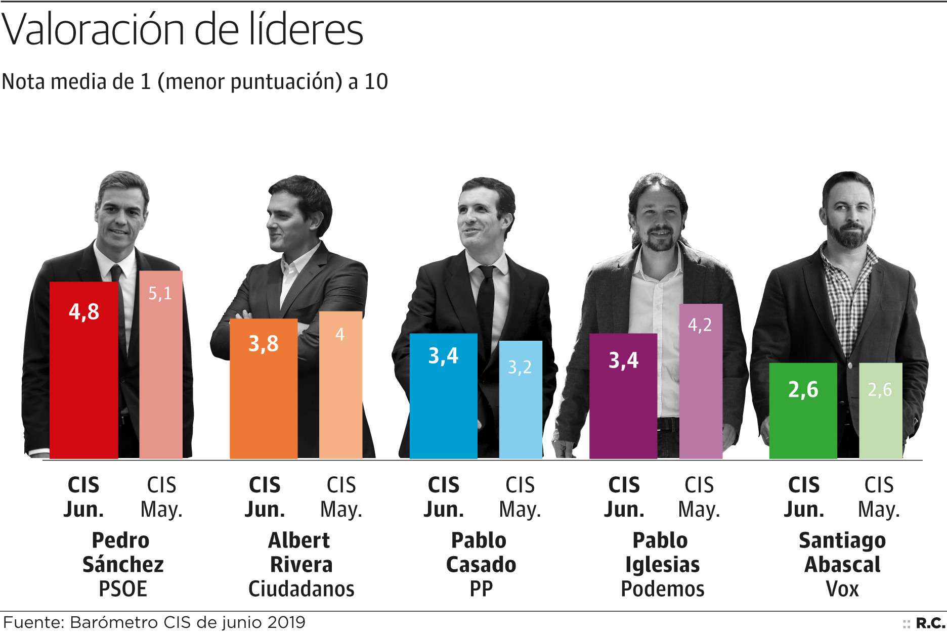 Pedro Sánchez continuaría como el líder mejor valorado con una nota media de 4,8, pero perdería el aprobado que alcanzó en el sondeo de mayo, 5,1. Detrás del secretario general del PSOE se sitúa el liberal Albert Rivera, 3,8, mientras que Pablo Casado y Pablo Iglesias empatan con un 3,4. Queda descolgado el líder de Vox, Santiago Abascal, con un 2,6 de nota media.