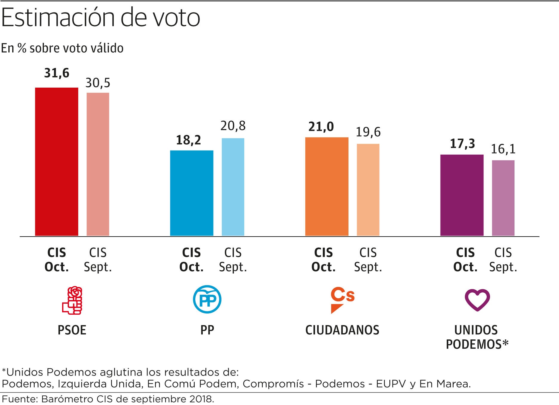 Por primera vez en su historia, el PP sería la tercera fuerza política de España. El sondeo del CIS de octubre presentado hoy señala que los populares obtendrían, si ahora hubiera elecciones, el 18,2% de los votos, por detrás de Ciudadanos, que alcanzaría el 21%. El PSOE, en cambio, consolidaría su liderazgo con el 31,6% de los sufragios. Unidos Podemos sigue estancado como cuarta fuerza, con un 17,3%.