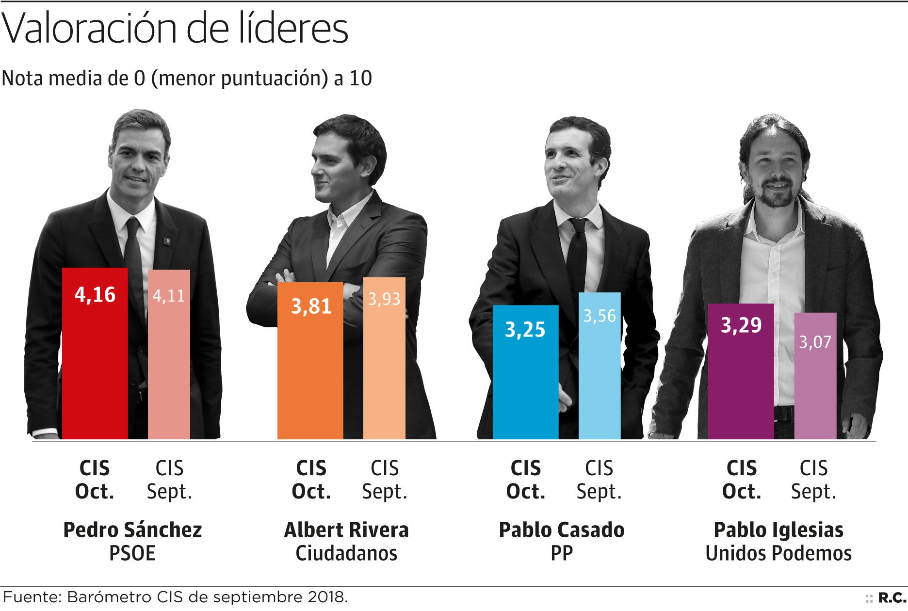 La valoración de los líderes políticos nacionales sonríe a Pedro Sánchez. El presidente del Gobierno recibe una nota media de 4,16, cinco centésimas más que hace un mes, y es el mejor conceptuado entre los máximos representantes de las cuatro grandes formaciones. Rivera pierde una décima en la valoración de los encuestados y se queda con 3,81, mientras que Casado pierde dos décimas y obtiene el 3,25. El presidente del PP es el que peor sale del examen porque Pablo Iglesias, el habitual farolillo rojo entre los líderes nacionales, le supera con 3,29.
