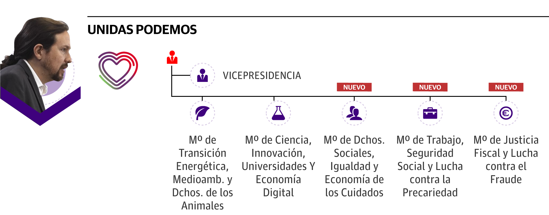 Los socialistas respondieron con una oferta en la que se mantenía una vicepresidencia y tres ministerios. Según se ha sabido en las últimas horas, la formación morada puso como condición obligatoria que desde el Gobierno en funciones se reconociera de forma pública que Irene Montero iba a ser la vicepresidenta. Esta última oferta suponía un cambio importante en la postura del PSOE, que pasó de asegurar que no aceptaba figuras de primer orden de Unidas Podemos en el Gabinete -como mucho en segundos rangos- a reconocer que llevarían una cartera. Al parecer, según las filtraciones más recientes, el escollo insalvable era Trabajo, área a la que aspiraba UP y que los socialistas no estaban dispuestos a ceder de ninguna de las maneras.