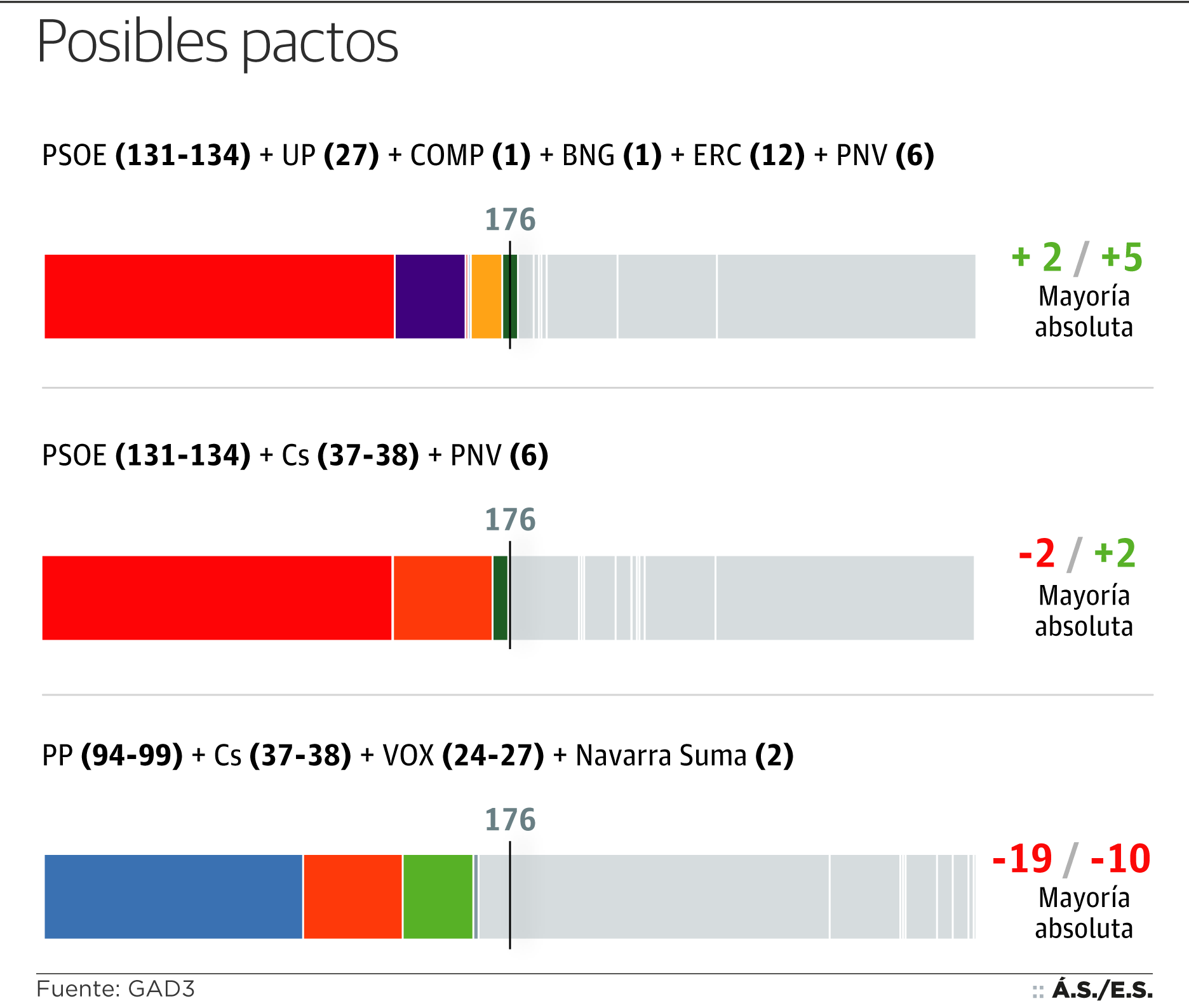 En las últimas semanas, y tras el pacto de Ciudadanos con UPN y PP en Navarra, cristalizado en la coalición Suma Navarra, y los coqueteos con los populares en Euskadi, ha empezado a abrirse paso la posibilidad de un acuerdos postelectoral entre PSOE, Ciudadanos y PNV. Los socialistas creen que una vez que los liberales han aceptado el régimen fiscal foral en estas dos comunidades se ha salvado el principal escollo para un futuro entendimiento que incluya al PNV. Quedaría por resolver el problema del sistema de cálculo del cupo, el «cuponazo», según Albert Rivera, que a juicio de Ciudadanos es poco transparente y consagra la desigualdad entre los españoles. Los nacionalistas, sin embargo, no parecen muy entusiasmados con la posibilidad de pactar con los de Rivera, que han sido su 'bicha' durante la última legislatura. Los números, por ahora, sí alcanzarían o se quedarían al borde porque la suma de las tres formaciones alcanza, de acuerdo a la encuesta de GAD3 para este periódico, entre 174 y 178 escaños.
