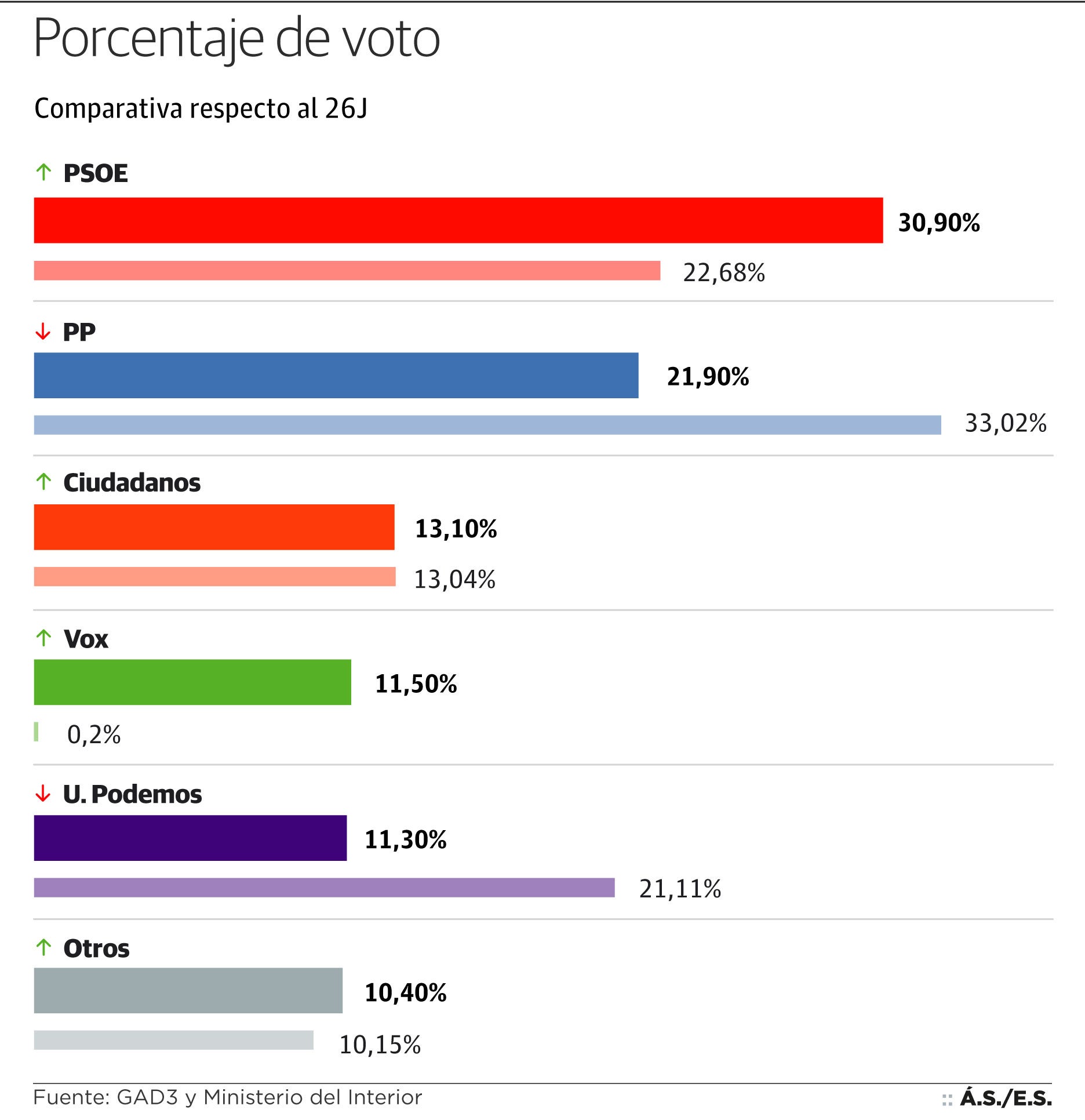 El PP, pese a su notable mejora en las últimas semanas (el último sondeo de GAD3 le daba 87 escaños), sigue bajo mínimos. De obtener los 94-99 asientos proyectados sería su peor resultado desde la refundación del partido en 1989. En las elecciones de aquel año, capitaneados por José María Aznar, sumaron 107. Los populares, sin embargo, pueden revertir la situación si mantienen la tendencia alcista. En el entorno de Pablo Casado lo dan por descontado, y aunque no se atreven a decir que superarán al PSOE, aseguran que sus números serán mejores que los que predicen las encuestas. Por ahora pierden once puntos y en el entorno de los 40 diputados respecto a junio de hace tres años.