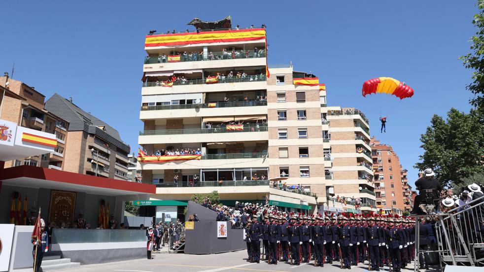 Uno de los momentos más emocionantes del desfile ha sido el aterrizaje de un paracaidista de la PAPEA del Ejército del Aire con la bandera de España en la estrecha calle que acoge el desfile, a menos de cien metros de la tribuna de las autoridades.