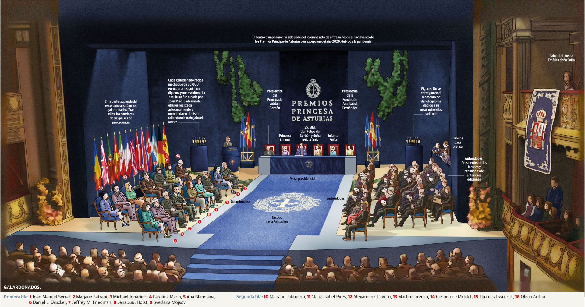 En la mesa presidencial, escoltada por las figuras de Miró que se entregan tras la ceremonia a los premiados -pesan ocho kilos cada una- y las banderas de Asturias, España y la Unión Europea se sentarán, de izquierda a derecha, el presidente del Principado, Adrián Barbón; la Princesa de Asturias, doña Leonor de Borbón; los Reyes de España, don Felipe y doña Letizia; la Infanta Sofía de Borbón, y la presidenta de la Fundación Princesa, Ana Isabel Fernández. A su derecha, sentados en dos filas, junto al atril en el que intervendrán las autoridades y varios de los premiados, y ante las banderas de sus trece países de procedencia, estarán los premiados de esta edición: Joan Manuel Serrat (Artes), Marjane Satrapi (Comunicación y Humanidades) -que finalmente podrá acudir a la ceremonia-, Michael Ignatieff (Ciencias Sociales), Carolina Marín (Deportes), Ana Blandiana (Letras), Daniel J. Drucker, Jeffrey M. Friedman, Jens Juul Holst y Svetlana Mojsov (Investigación Científica y Técnica), Mariano Jabonero, María Isabel Pires, Alexander Chaverri y Martín Lorenzo (de la Organización de Estados Iberoamericanos, Premio de Cooperación Internacional) y Cristina de Middel, Thomas Dworzak y Olivia Arthur (de la Agencia Magnum de Fotografía, Premio de la Concordia).