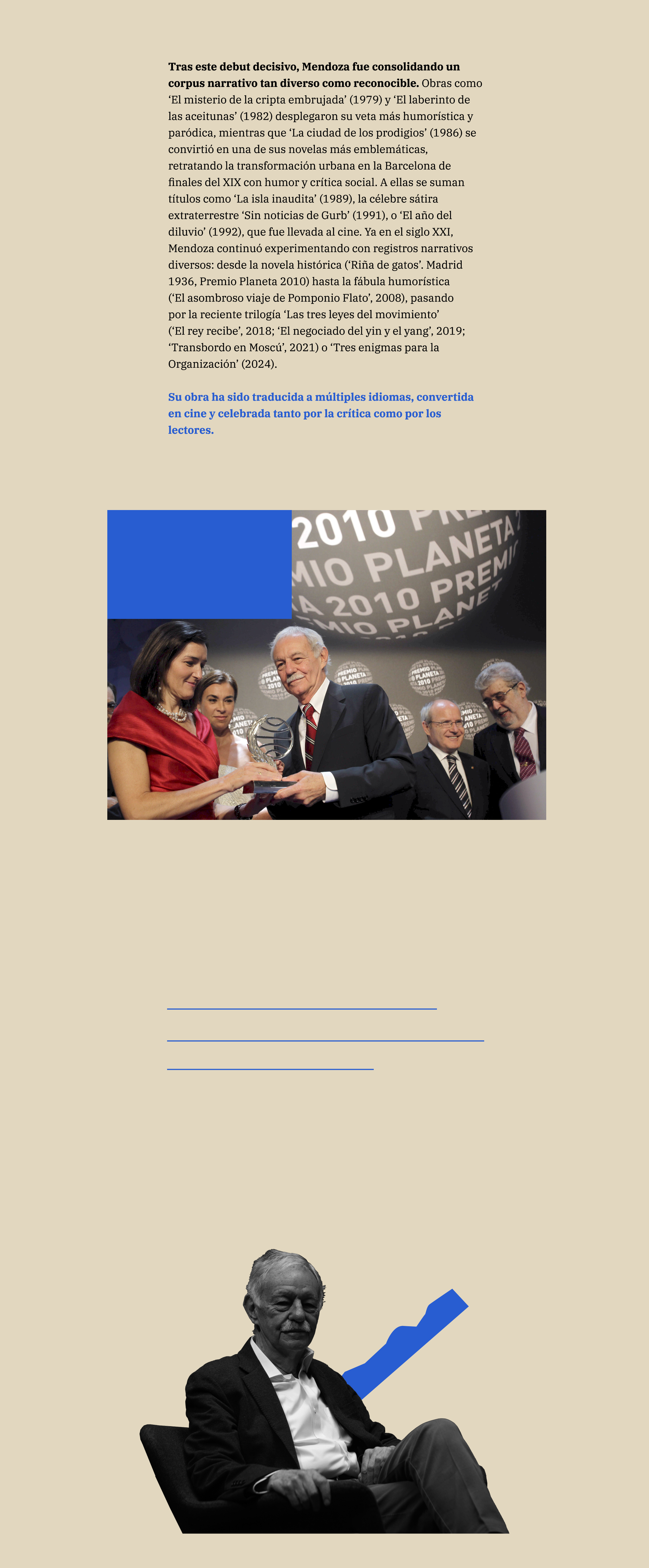 y ‘El laberinto de las aceitunas’ (1982) desplegaron su veta más humorística y paródica, mientras que ‘La ciudad de los prodigios’ (1986) se convirtió en una de sus novelas más emblemáticas, retratando la transformación urbana en la Barcelona de finales del XIX con humor y crítica social. A ellas se suman títulos como ‘La isla inaudita’ (1989), la célebre sátira extraterrestre ‘Sin noticias de Gurb’ (1991), o ‘El año del diluvio’ (1992), que fue llevada al cine. Ya en el siglo XXI, Mendoza continuó experimentando con registros narrativos diversos: desde la novela histórica (‘Riña de gatos’. Madrid 1936, Premio Planeta 2010) hasta la fábula humorística (‘El asombroso viaje de Pomponio Flato’, 2008), pasando por la reciente trilogía ‘Las tres leyes del movimiento’ (‘El rey recibe’, 2018; ‘El negociado del yin y el yang’, 2019; ‘Transbordo en Moscú’, 2021) o ‘Tres