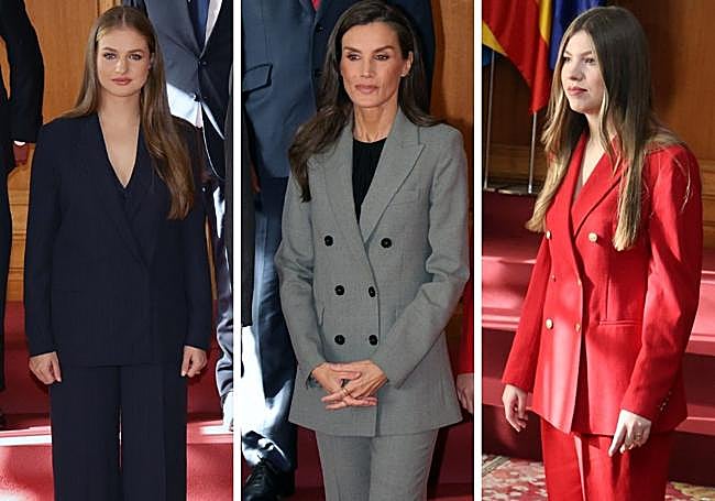 La mañana del viernes, la reservada a las audiencias, fue la heredera a la Corona la que confío en la marca Hugo Boss y mantuvo su idilio con el azul oscuro. Su traje sastre decorado con una discreta raya diplomática no era nuevo; lo había puesto un mes atrás durante una visita a Navarra. Su madre lució un traje gris de Mango, un indispensable en cualquier armario, y su hermana se diferenció apostando por el rojo de Tommy Hilfiger que anecdóticamente pertenece a la colección 'The Sofia Capsule'.