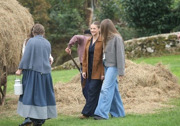 Pasearon junto a los animales y la hierba, conversaron con los vecinos y se lanzó la Princesa a elaborar chorizos a la manera tradicional. Bromeaba doña Leonor que no era aquella una actividad habitual entre las gentes de su generación y, sin embargo, se dispuso a ello con gracia antes de pasar a la bolera, donde ni ella ni su hermana quisieron probar suerte para evitar percances: «¡Imagínate si le das a una cámara o a una persona!», exclamaba doña Sofía. Sí que lanzó la bola su padre, que consiguió derribar dos bolos ante la mirada de curiosos y expertos en la materia que lo calificaron de buen golpe. Los vecinos les mostraron el arte de la cestería, algunas labores de agroganadería o cómo se cabruña una gaudaña para segar. Pudieron ver cómo se lavaba la ropa antaño -lo hacía Carmina, la mujer de Celso, con quien se detuvieron largo y tendido- y doña Leonor y doña Letizia se animaron a mayar las manzanas con las que se elabora una sidra que don Felipe recibió de buena gana.