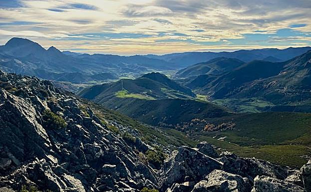 A esta cumbre le faltan apenas 30 metros para estar a 2000 de altitud: por eso es el techo de Teverga y por eso resulta un balcón de excepción que obsequia con amplias y espectaculares visiones. Peña Rueda, Los Huertos del Diablu, el Ranchón, los Fontanes, Los Albos, las Ubiñas… lucen espectaculares desde este trono tevergano, pero también lugares como la sierra del Sueve, que se divisa en un lejano horizonte haciendo de muralla a la costa oriental. Por no hablar del exuberante hayedo de Montegrande o los hondos valles, en los que destaca diminuta la braña de las Cadenas por la que hemos pasado o la leonesa comarca de Babia, rodeada de verdes pastos.
