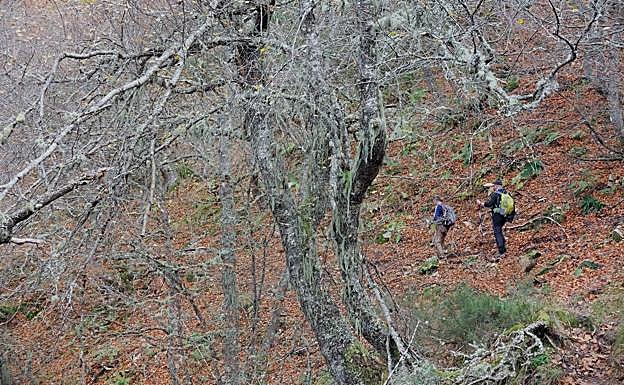 En esta excursión se pisan muchos sitios importantes, sacros, de esos que forman parte del carácter y las bellezas de Asturias. Para empezar, un hayedo. Muy viejo. Lo llaman Montegrande y es una de las manchas forestales asturianas de más importancia: todo un templo natural que durante el otoño ofrece un espectáculo de luz, color y sonido capaz de robar el corazón a cualquiera que lo cruce.