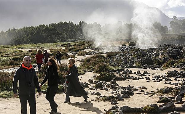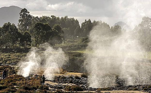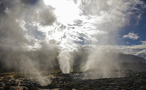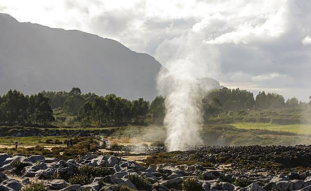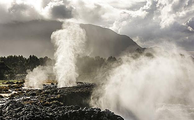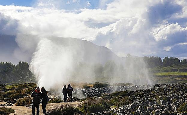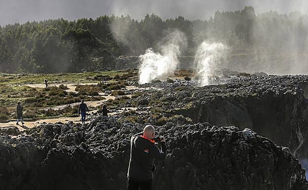 El trayecto prosigue hacia el Este por encima de la playa, donde tomamos un camino de tierra señalizado que lleva al Bramadoriu de Llames, el campo de bufones más importante de la ruta, en el que podremos escuchar los bufidos que provocan las corrientes de aire comprimidas en las galerías al ser empujadas por la fuerza del oleaje y, si hay marejada, observar -siempre con precaución- los numerosos bufones a nuestro alrededor, torrentes de agua expulsados de la bóveda con gran fuerza que pueden alcanzar decenas de metros de altura. En las proximidades hay un aparcamiento.