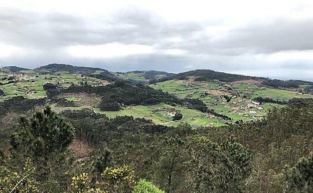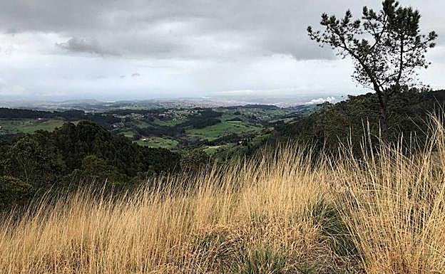 Desde lo alto del pico Friera (617 metros), con vértice geodésico Gorfolí, avistamos Avilés y la costa Cantábrica, la Sierra del Aramo al sur y, a lo lejos, los Picos de Europa.