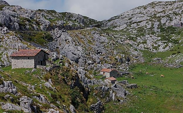 Comenzamos a caminar por una pista ancha que asciende de forma constante entre praderas y majadas tradicionales. Cabañas de piedra y pastos verdes se alternan con zonas más pedregosas, siempre acompañados por el perfil inconfundible de las cumbres calizas.