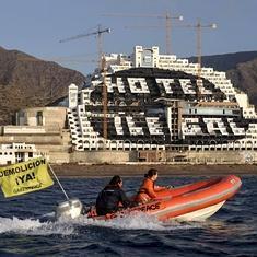 Los ecologistas han pintado un enorme punto negro en la fachada del hotel, de 21 plantas y 411 habitaciones construido por Azata, para exigir su desmantelamiento inmediato