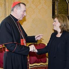 Durante su reunión con Parolin, la vicepresidenta ha abordado las relaciones bilaterales entre España y la Santa Sede, y algunos asuntos de la actualidad internacional, como la situación en Escocia y en Cataluña, "los retos a los que se enfrenta Europa", según ha definido Santamaría.