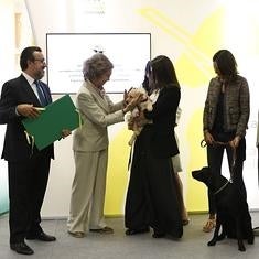 La Reina Sofía y el presidente de la ONCE, Miguel Carballeda, entregan un diploma a una familia que acoge perros guía.